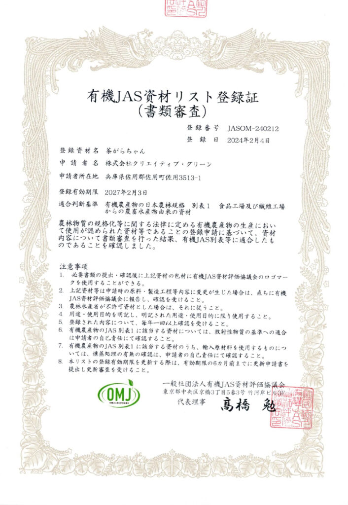 茶がらちゃんが有機JAS規格に基づく使用可能資材リストとして認定されました。