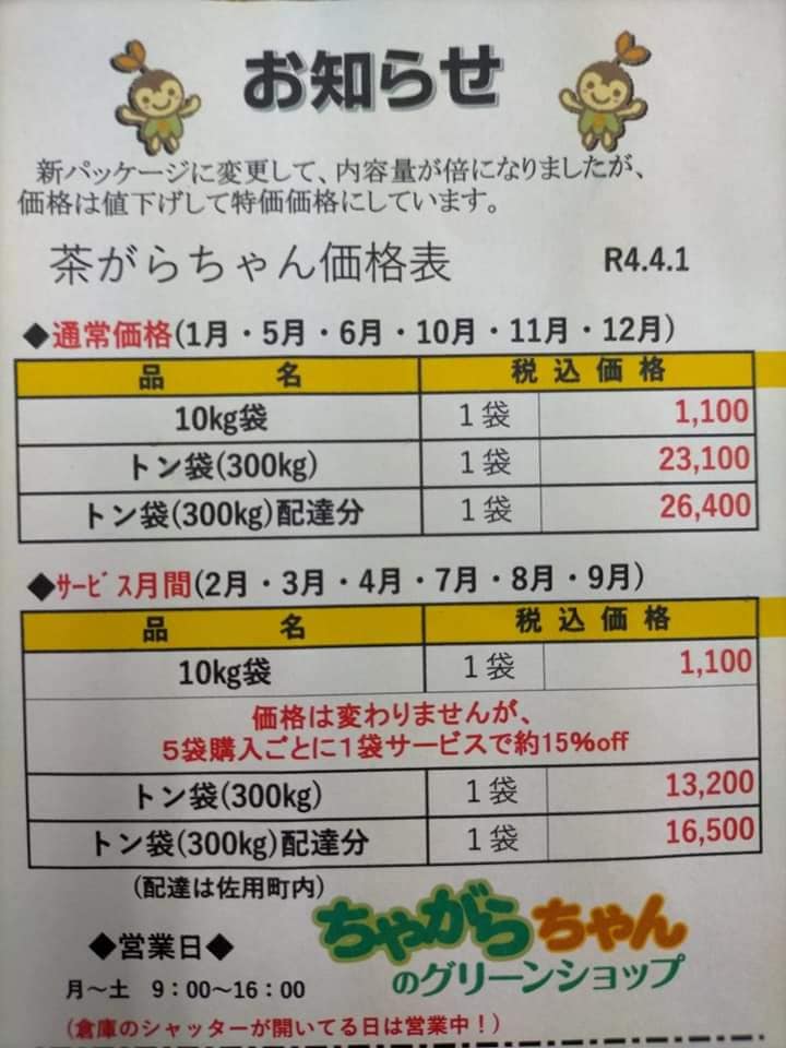 春のサービス月間 お知らせ 2023.04.10 2,3,4月はサービス月間です。 小袋(10kg)を5袋購入ごとに1袋サービス! 大袋(300kg)は通常23,100円→13,200円に! 4月末までになりますので、ぜひお越しください。